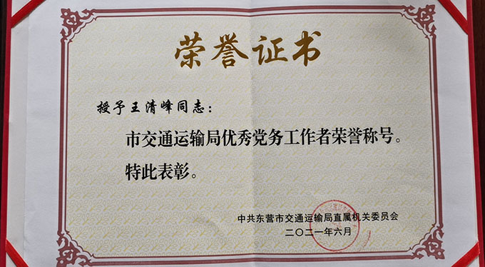 • 王清峰榮獲“市交通運(yùn)輸局優(yōu)秀黨務(wù)工作者”